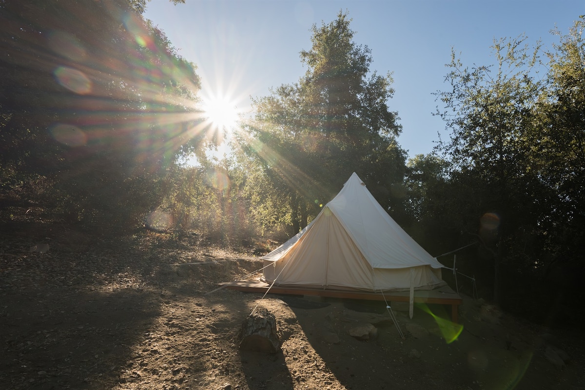 歡迎來到寧靜的帕洛馬山的私人豪華露營帳篷! 這個寬敞的鐘形帳篷位於 67 英畝的牧場上,高 3,600 英尺,包括一張雙人床和一張雙人折疊沙發,非常適合情侶、家庭或朋友入住。 四周環繞著橡樹、星空和山間空氣,您將同時享受舒適和大自然。 真正的「自備食物、自行清理」冒險,可選擇升級至我們的即時露營套餐,配有炊具、爐具和丙烷加熱器。 營地主人 24 小時待命。