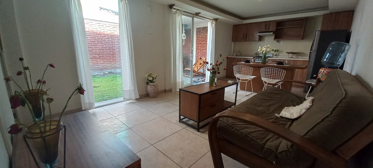 入住這間位於克雷塔羅市中心的舒適單間公寓,享受這裡的時尚體驗。如果您要造訪這座城市,這是完美的位置身地點。步行即可抵達附近的餐廳、酒吧、咖啡館、博物館、商店等。 公寓設有設備齊全的廚房、寬敞的全套浴室、舒適的臥室,配有電視、空調、衣櫃和工作空間。它還有一個共用入口、小型共用露臺、室外餐桌和許多植物,讓您感受像家一般的舒適。