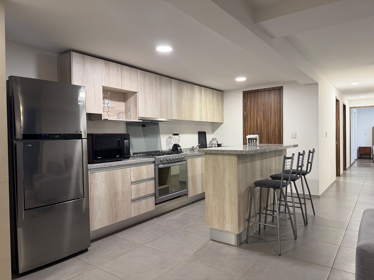 入住超級公寓,享受您在克雷塔羅( Querétaro )的旅程,家具齊全,非常舒適,空間寬敞。 客廳、餐廳。2間臥室。1張KS牀、1張墊子牀和1張墊子沙發牀。 風扇。設備齊全的廚房。2間全功能浴室。 WiFi。有線電視。大廳的BT音箱。 Alexa。洗碗機。陽臺,配有桌椅,可供2人使用。 停車2輛車。門禁公寓的24小時監控。 智慧電子鎖。Plaza Antea和Uptown ( 8分鐘。 距離市中心15分鐘路程。 距機場25分鐘路程。