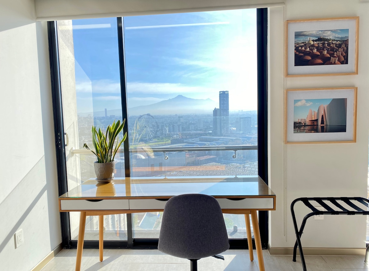 Bright, modern high-rise space on the 18th floor with open city views. Ideal for couples, friends, and relaxed longer stays. 3 Queen beds for up to 6 guests Equipped kitchen Large-capacity washer and dryer Electric blinds and high-speed Wi-Fi for home office Enjoy a 24/7 GYM, rooftop, and in-building parking for 2 cars Pet-friendly building with security service and 24/7 security cameras Quick access to Cholula, Angelópolis, and key attractions