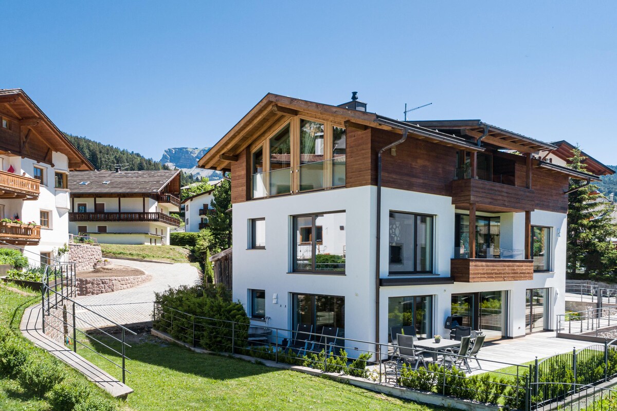 Das komplett neu und stilvoll eingerichtete Alpine Chalet Aurora Dolomites befindet sich im Bergdorf Lajen in ruhiger und sonniger Lage. Direkt an Wiesen, Felder und Spazierwege angebunden, kann die wunderschöne Naturlandschaft des Eisacktals und des Grödnertals genossen werden. Das Alpine Chalet Aurora ist mit einem eigenen Open-Air-Solarium bzw. einer großen Gartenterrasse, einem Essplatz, einigen Sonnenliegen und vielen Spielgeräten für Kinder ausgestattet.