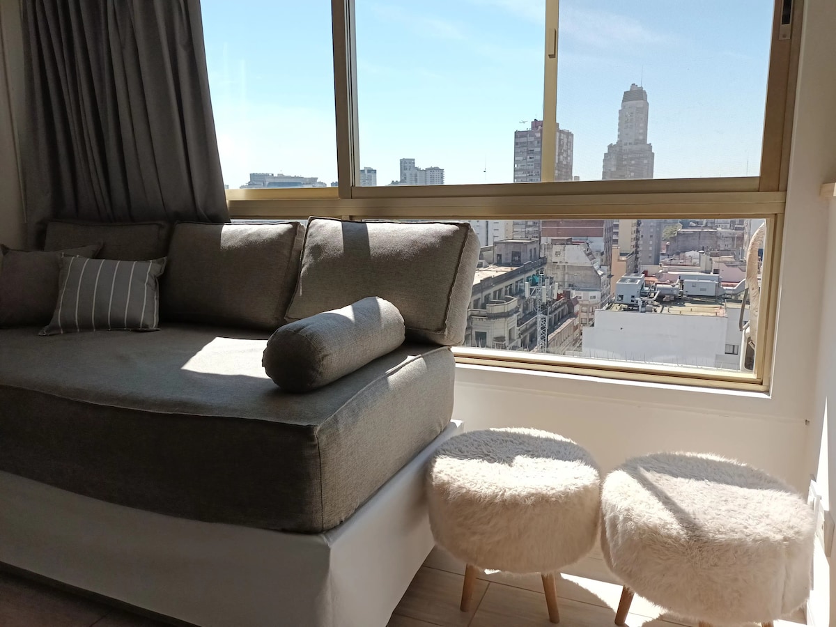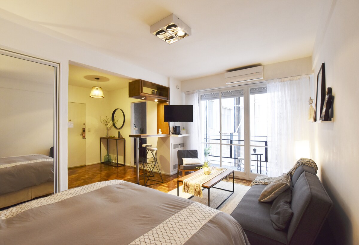 全新單間公寓,配有床和沙發床、電視、WiFi、獨立浴室和廚房、中央暖氣和空調。明亮、溫馨且安靜。 位於市中心,Av Córdoba 和 Maipu。距離 Galerías Pacifico 和 Florida 步行街僅幾公尺。距離地鐵B線和C線以及雷蒂羅站僅幾個街區