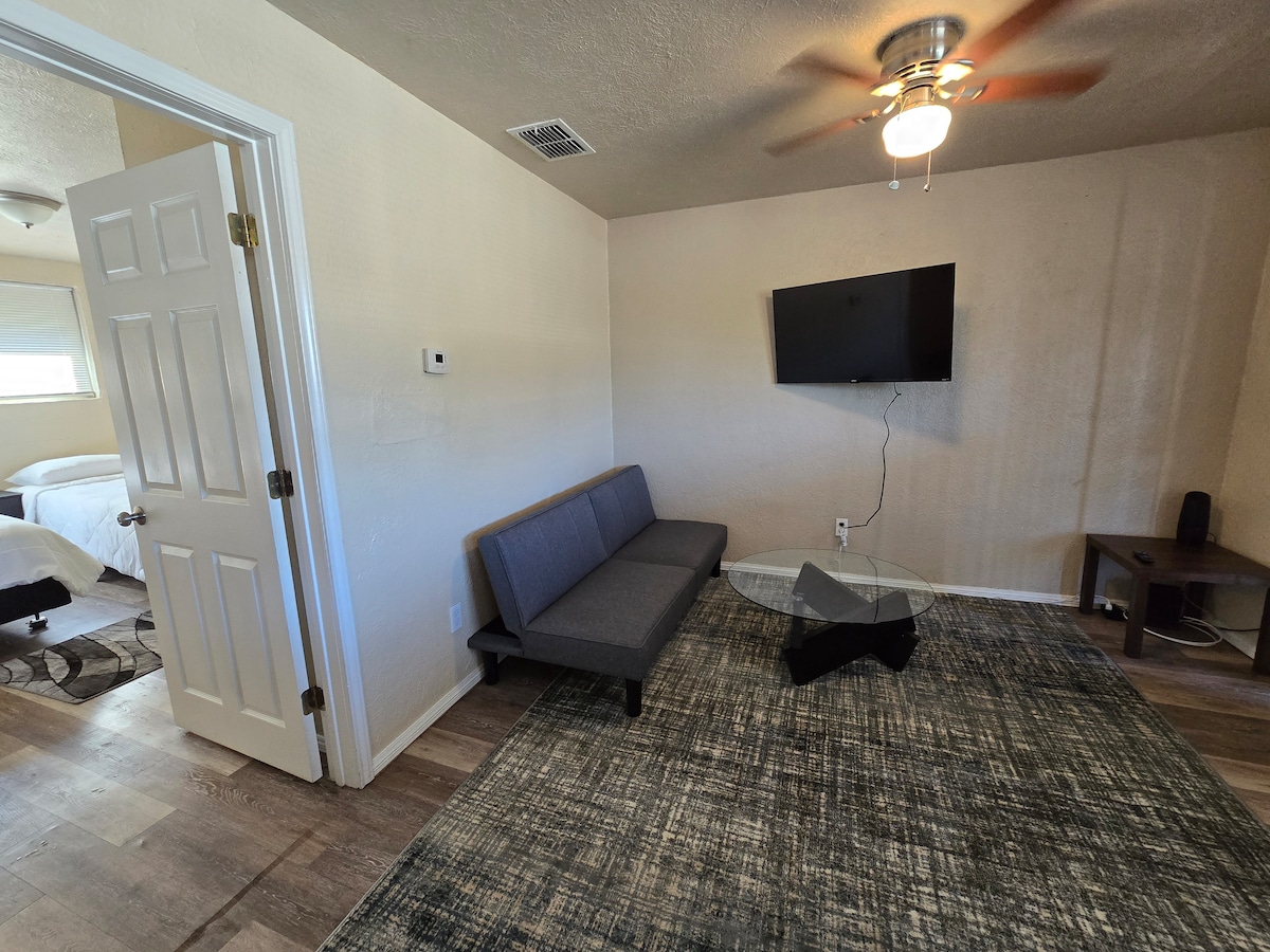 Welcome! This rental has two bedrooms, one bath, a pull out sofa bed in the living room, full kitchen, and a laundry room. WiFi and a 55 inch TV in living room. Enjoy our new, cozy rental just steps from the Post OG music venue. Whether you’re here for a show, a quick business trip, or have family or friends in town this cute spot is sure to accommodate you.