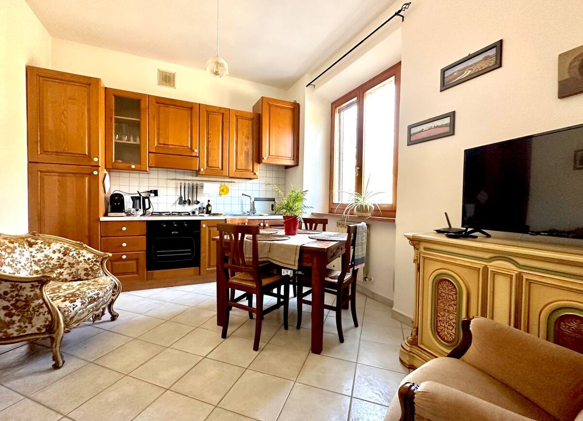Wonderful apartment on the street that runs along the ancient walls of the historic center of San Quirico d'Orcia, perfect to immerse yourself in the atmosphere of our charming Tuscan village. The large windows provide an incredible amount of natural light that illuminates every corner of the apartment, creating a very cozy atmosphere. The kitchen has all the amenities: stove, oven, refrigerator, coffee maker and kettle for tea and herbal teas. An ideal place for unforgettable stays!