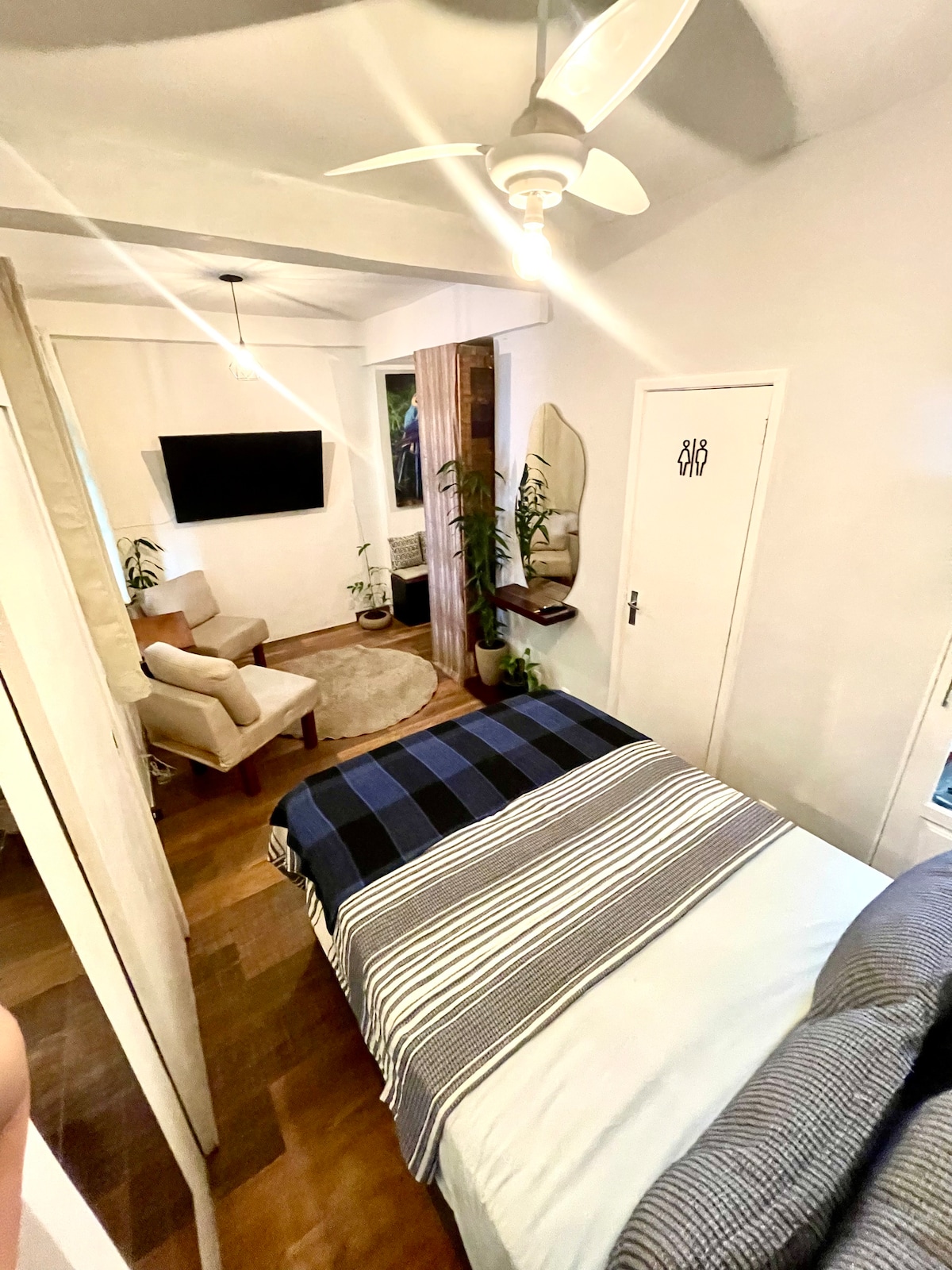 Espaço inteiro. O apartamento é amplo, aconchegante, organizado, arejado e bem iluminado, com sol da manhã. No quarto tem cama de casal nova e closet. A sala é grande com mesa de jantar, sofá-cama (casal) e varanda com plantas e rede de descanso. A cozinha é completa com todos os utensílios. O banheiro é reformado com chuveiro 220v. O espaço possui ar condicionado. Além disso, o quarto possui ventilador de teto e, na sala, ventilador portátil de chão.