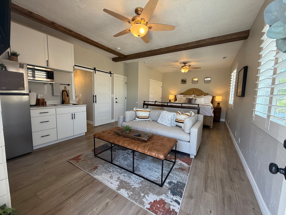 歡迎來到我們美麗的南猶他州的小秘密! 這間公寓有一間寬敞的大房間,內有拱形天花板和一個漂亮的遮蔭露臺,可供戶外用餐和觀賞壯觀的日出。 價格也很優惠! 它有一張新的加大雙人床,家具精美,靠近城鎮周圍的大量活動。 您一定會喜歡入住這裡!
