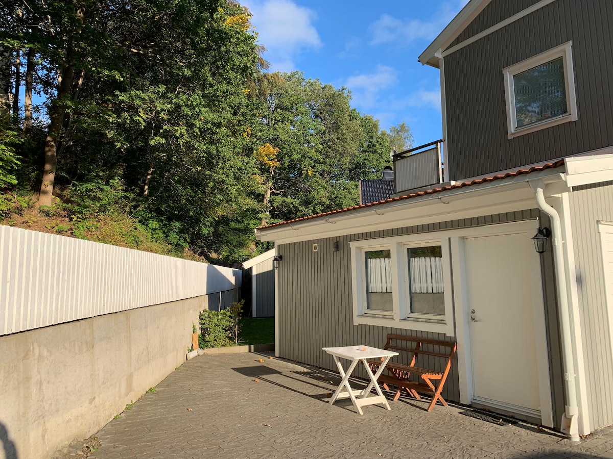這間客用住房擁有獨特的位置,有自己的沐浴路徑( 200公尺) ,通往Finnsjön ,那裡還有一艘劃船。 有漂亮的遊泳、運動步道、照明小徑、戶外健身房、自行車道和徒步道,非常適合戶外愛好者! 開車前往哥德堡市中心僅需15分鐘。 您住在一間36平方公尺的新建房子,可容納2-3人,並有自己的隱私保護、家具齊全的露臺。 包括咖啡、茶和麥片/麥片。 在旺季, 5月至9月只接受最少2人的預訂。
