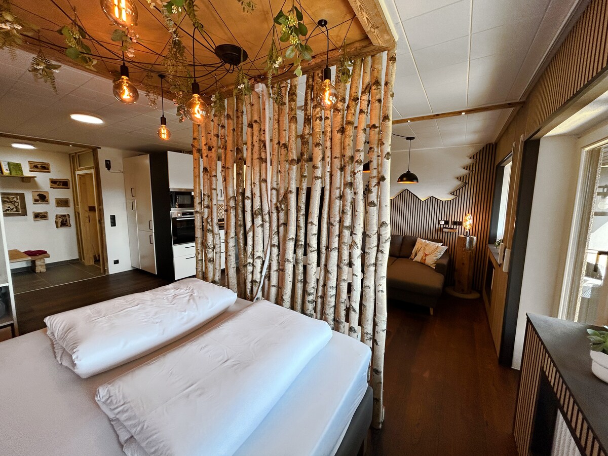 Auf 1000 Meter Höhe begrüßen wir dich mit einer atemberaubenden Sicht auf Schonach und den Schwarzwald. Entspanne in einem 2023 komplett renovierten Apartment mit topmoderner Ausstattung und viel Liebe zum Detail. Ob echter Baum im Wohnzimmer, Blumendecke über dem Bett, Fachwerkwände, Regendusche im Wald oder echtes Steinwaschbecken: Durch viele, hochwertige Details kommen Designliebhaber nicht zu kurz. Direkt am Waldrand gelegen ist der Fabelwald perfekt für Naturliebhaber.