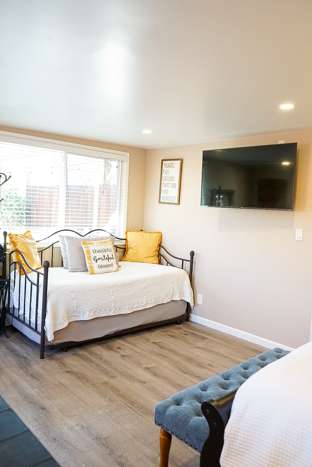 享受時尚體驗,提供一間臥室、一間浴室、加大雙人床和周圍露臺。私人車道上最多可停放2輛車的私人停車位。 位於市中心附近,附近有許多當地餐廳、麵包店和啤酒廠。 可考慮小型寵物。獨立前、側和後露臺。 房子提供冷熱空調,讓您的環境達到所需的溫度。 我們有市場上最強的WiFi。 非常適合情侶度假!