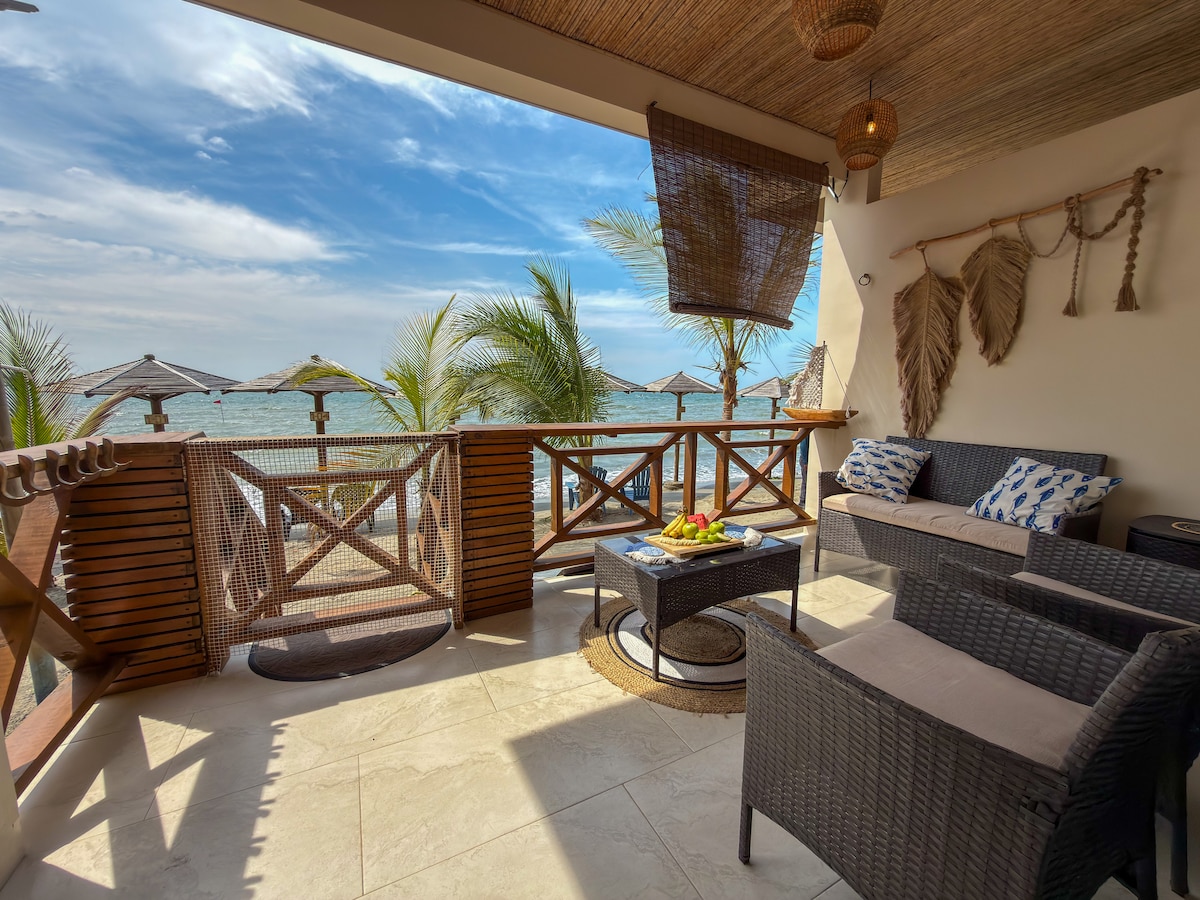 壯觀的海濱套房,一樓有私人海灘、泳池和24小時禮賓服務,提供舒適和安靜;專為情侶、家庭、朋友或旅客設計,尋找溫馨的氛圍、夢幻的日落、微風和哥倫比亞加勒比海海灘的寧靜。 -標準雙人床+輔助床 -索法卡馬(Sofacama) -智慧電視 -WiFi -廚房 衛浴 -空調 -戶外露臺 -承運人 -沙灘遮陽傘式小攤