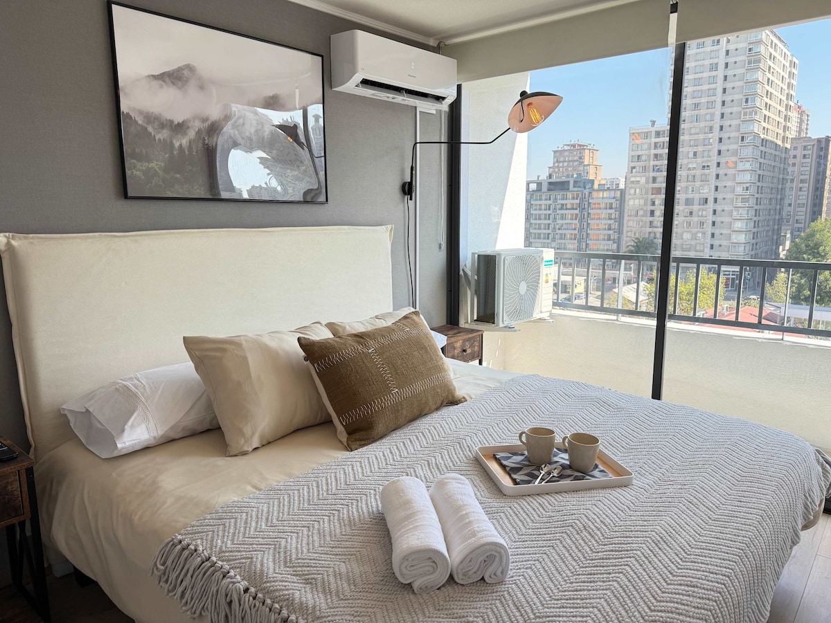This apartment is ideal for relaxing and enjoying the city. It's centrally located, between the Santiago Centro and Providencia districts, one of the best locations in the city. It offers beautiful views of San Cristóbal Hill and the Sky Costanera. It's just a 3-minute walk from the metro and buses. Includes: Free Wi-Fi, a fully equipped kitchen, sheets and towels included, a large bed with a large Smart TV. Self-service entrance with a key, allowing you to arrive at any time.