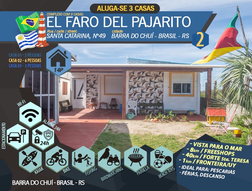 Casa pé na areia com deck privativo com escada a beira mar, sacada ampla inferior e superior, deck com bancos, espreguicadeiras e rede. Forno e fogão a lenha, além de churrasqueira tipo parrijeira e lareira. Cozinha completa. Peças amplas e arejadas. Colchões com capas higienizáveis. Um paraíso para festejar com amigos e familia. Tem pranchas, morey e bicicleta. A noite do deck superior se pode ver a iluminação do farol do Chuí, que divide Brasil e Uruguai.