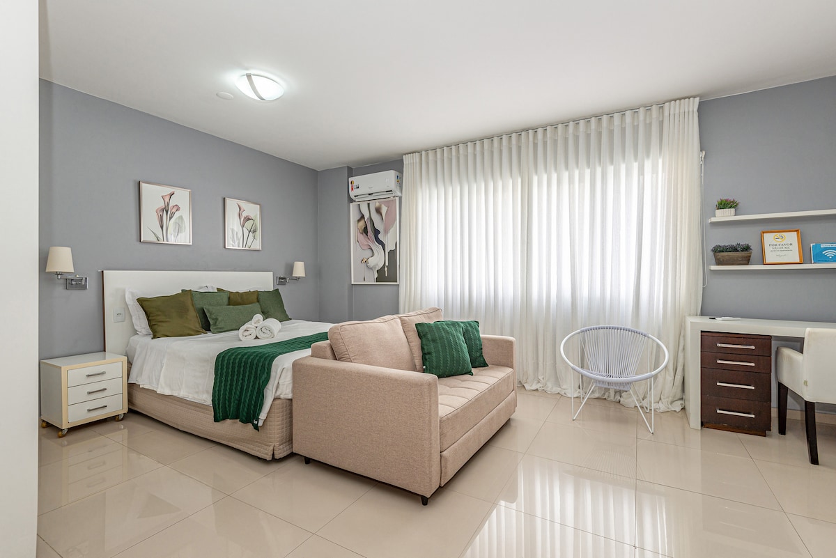 舒適的公寓,地理位置優越,位於阿爾法維爾市中心! 靠近麵包店、市場、商場、商店、餐廳、銀行、藥店和醫院。 位於安靜、安全、安靜的街道上,大樓內有: 櫃檯提供24小時全天候服務。 餐廳提供早餐、午餐和晚餐(請在餐廳查看價格)。 健身房。 游泳池(目前正在翻新)。 除其他外…… OBS :可以將2張單人牀分開。