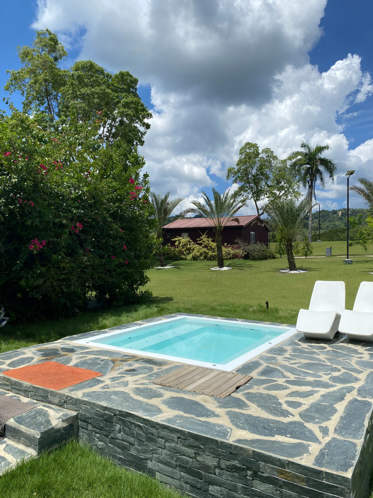 hermoso Guest House de 75mts de construccion ideal para luna de miel y pasar tiempo con su pareja , es una habitacion completa con su baño , agua caliente , cocina equipada , jacuzzi , espacio para fogata , bbq de gas , hermosa vista panoramica , Incluye gazebo con piscina común del complejo , Río con cascada dentro del complejo. Disponibilidad de alquiler: Minimo 2 Noches