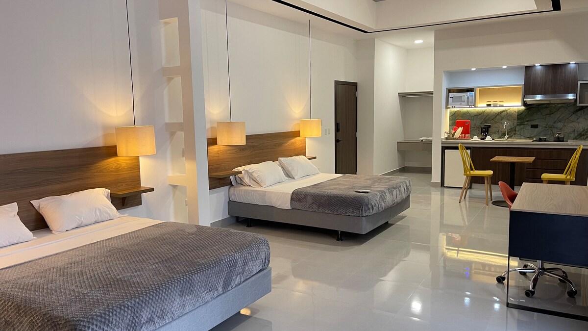 在這個奢華的地方放鬆身心,所有內容都包含在我們的頂級套房中! 獨家大樓泳池!位於聖多明哥最獨特和適合兒童的區域。 在Rio lelia , Mutualista Benalcazar ,靠近購物中心2分鐘,非常靠近市內所有地方。 此外,我們在開發的24小時停車場有一個車庫和監護人,客廳和房間還有50英寸電視