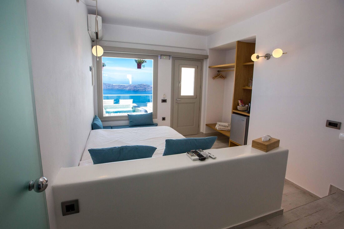 Η υπέροχη Sea Suite, αποτελείται από έναν ενιαίο χώρο με ένα διπλό κρεβάτι, καθώς και έναν καναπέ-κρεβάτι, οπότε μπορεί να φιλοξενήσει έως και 3 άτομα. Υπάρχει επίσης μικρή κουζίνα, εξοπλισμένη με καφετιέρα, μπάνιο με προϊόντα περιποίησης, ντουλάπα, σίδερο, δορυφορική τηλεόραση και ηχεία, ενώ στον υπαίθριο χώρο τζακούζι προσφέρονται επίσης υπηρεσίες σκίασης για μοναδικές στιγμές χαλάρωσης! Τέλος θα σας εντυπωσιάσει η γρήγορη ταχύτητα του WiFi και η υπέροχη θέα στην φανταστική καλντέρα .