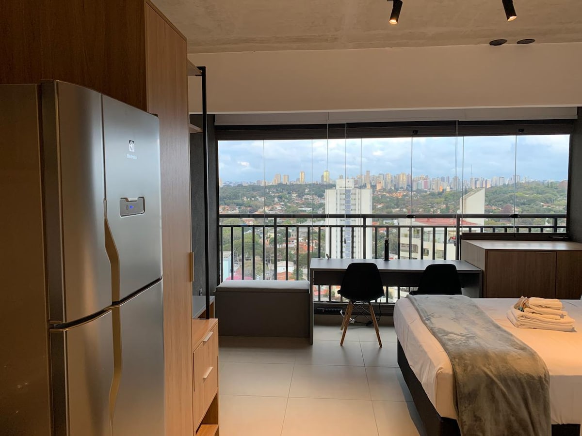 Studio equipado com vista (23m2 - 19º andar). Apto está ao lado da estação Brooklin do metrô, e 12 minutos de carro até o Aeroporto de Congonhas. . >> Locais próximos: . Hípica Paulista . Clínica Einstein . Consulado Americano >> Shopping centers próximos: . Shopping Morumbi . Shopping D&D . Shopping Ibirapuera . Shopping JK Iguatemi >> Você terá no condomínio: . Portaria 24h; . Academia; . Lavanderia OMO; . Coworking