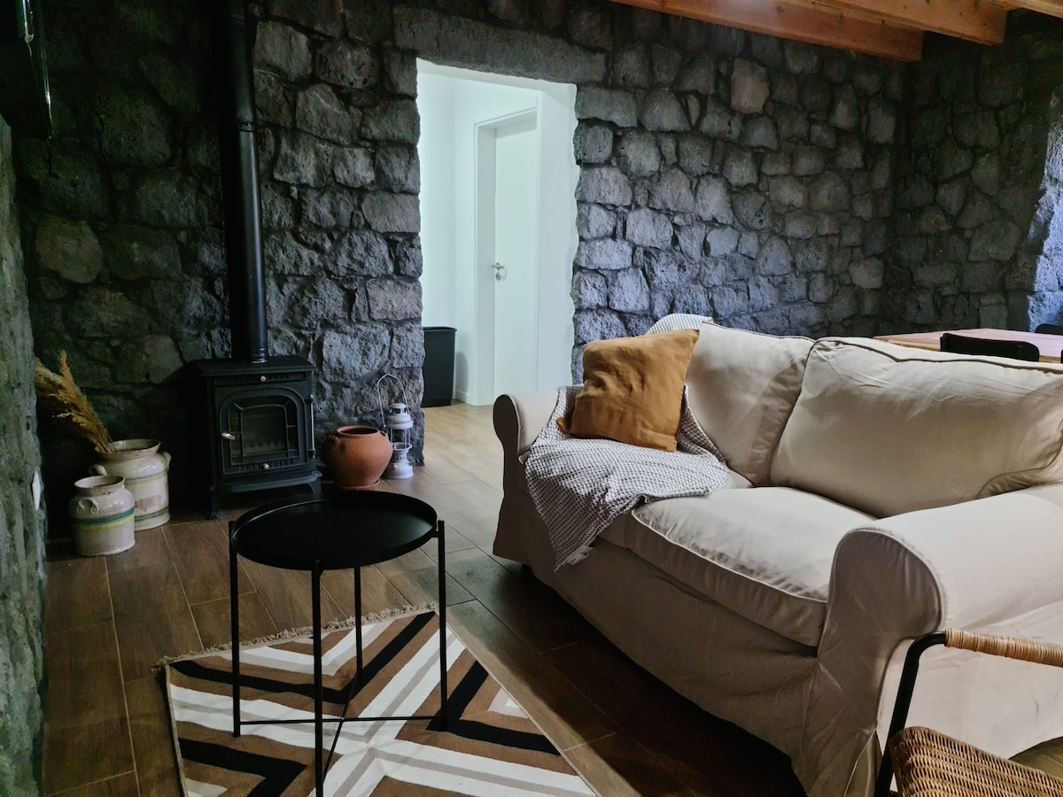 Would you like to live in a stone cottage, rustic, but with a modern ambiance and interior, comfortable, romantic, ideal for two with stunning views? You're in the right place, it's here. There is a deck with lounge chairs, a stone barbecue, the full view of the island of São Jorge and the canal. From its left side, the cliffs of the parishes of São Roque, Praínha and Santo Amaro do Pico, crashing waves and fluttering birds; a sunset to fall in love with… This house is part of a small family owned resort, where there is a restaurant called Magma, a grocery store, a yoga room and an heated swimming pool. The living room has glass sliding door that open the interior nature and the views. What are you waiting for?