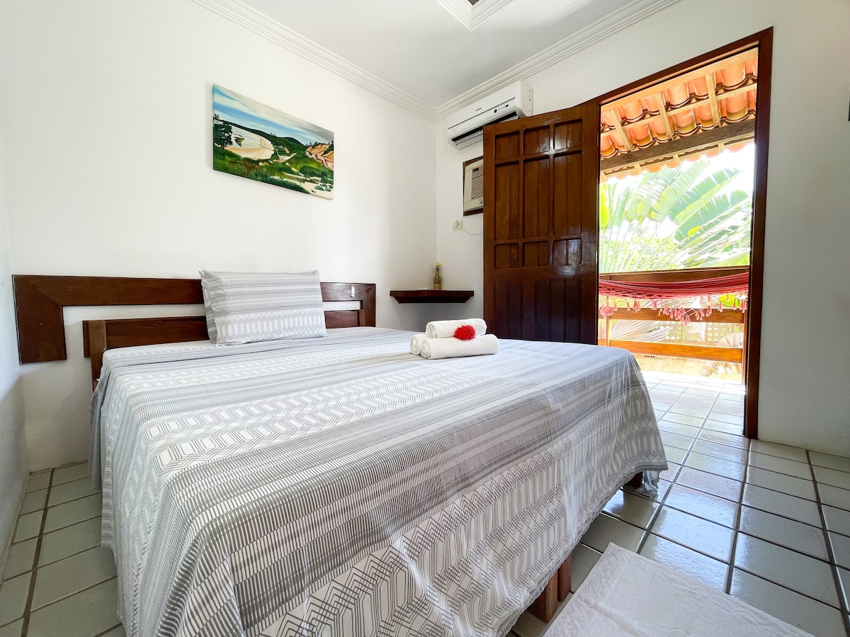 A acomodação Standard Térreo Tripla comporta até 03 hóspedes com 01 cama de casal mais 01 cama de solteiro. Equipada com ar condicionado, frigobar, smart TV, closet aberto, banheiro privativo, chuveiro elétrico, enxoval completo e varanda privativa com rede.