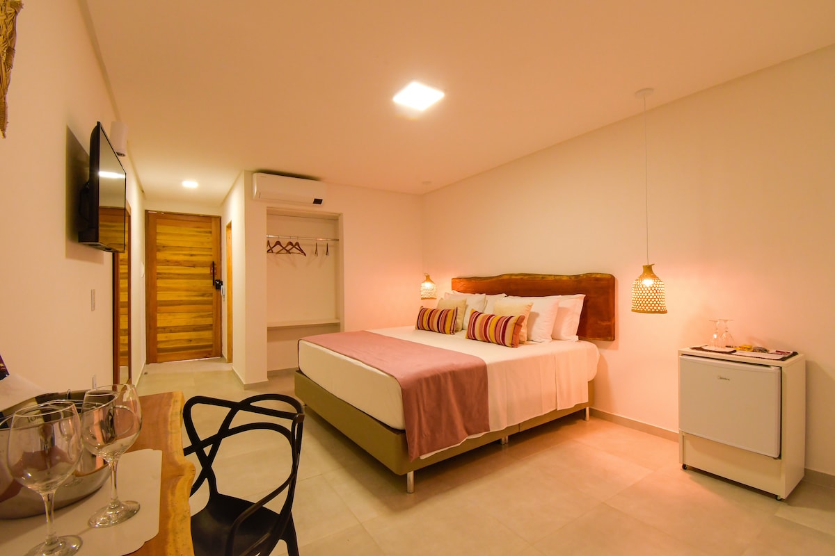 O quarto possui uma cama queen, frigobar, smart TV e ar-condicionado split, oferecendo privacidade e máximo conforto para duas pessoas.