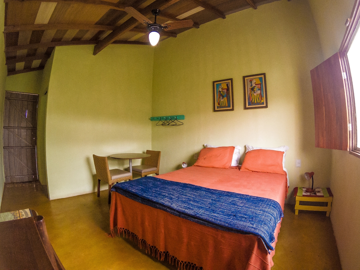 Este quarto é externo à casa principal, com uma cama de casal.
