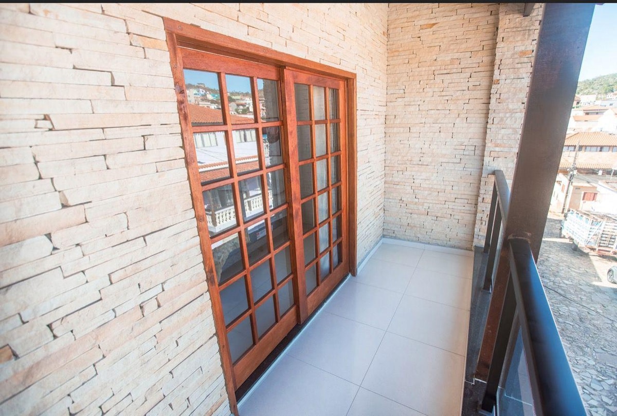 Paredes de vidro permitem um visual incrível da sala, onde o hóspede tem acesso ao por do sol e montanhas sem sair de casa. Nos quartos, escuridão necessário para uma ótima noite de descanso. Privilegiada por estar no centro da cidade, colada na praça. Novinha, limpa e pensada com o maior carinho para te receber. Pertinho de todos os serviços essenciais e turísticos como mercado, farmácia, bares, restaurantes, agência de passeios, etc. Será um prazer receber você !