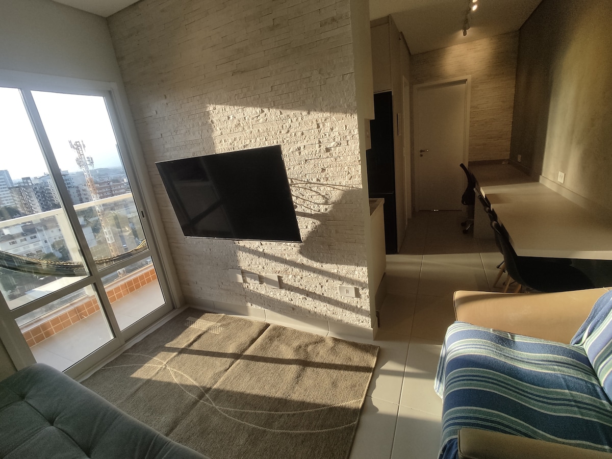 Apartamento tipo "Flat studio" novo e totalmente planejado em Praia Grande, com dormitório integrado, varanda gourmet e ambiente climatizado, moderno, confortável e funcional. Ideal para amigos, casais e famílias. Localização privilegiada, próximo à praia, mercados, farmácias, padarias, restaurantes e comércio em geral. Condomínio com estacionamento, segurança e estrutura moderna. Praticidade, conforto e excelente custo-benefício para sua estadia no litoral.
