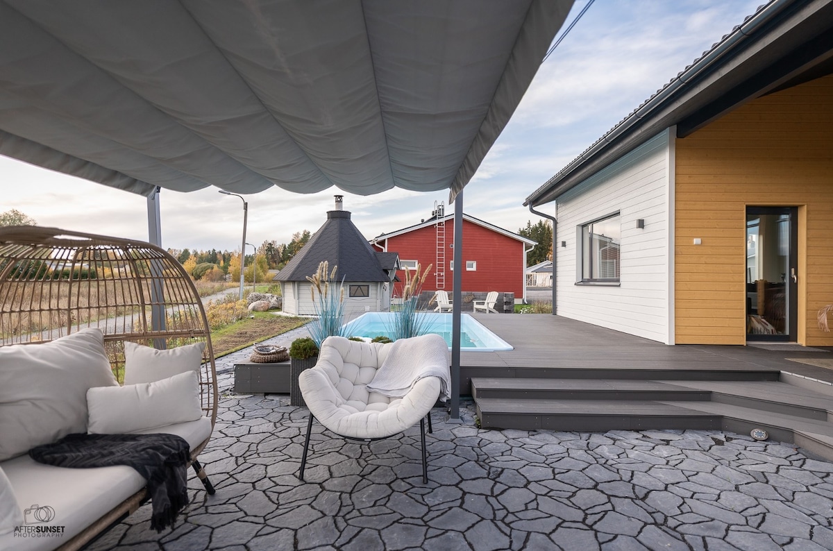 寬敞奢華的私人房源,專為放鬆身心的住宿而設計。 享受您自己的溫水泳池、浴缸、室內和室外桑拿房、多個露臺和65平方公尺的開放式客廳+廚房,非常適合度假或聚會。 內外空間寬敞,非常適合情侶或團體入住。 無論是想在泳池旁放鬆身心、泡澡、享受傳統的芬蘭桑拿浴,還是在露台上度過漫長的夜晚,這間房源都能為你提供私密、舒適和獨一無二的住宿體驗。