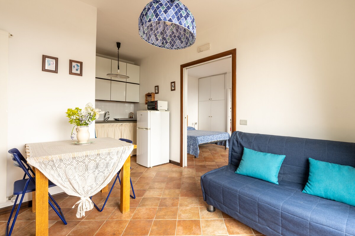 Very panoramic apartment of 30 m² with 4 beds, separate entrance, living room with kitchenette, double sofa bed, double bedroom, bathroom with shower, large outdoor terrace equipped with tables and barbecue. Simple and modern furnishings, equipped with washing machine, dishwasher, fridge, TV and heating. Parking inside the entrance gate. About 200 meters municipal pool located in pine forest, very quiet and economic. The "blue flag" sea is about 15 minutes by car.