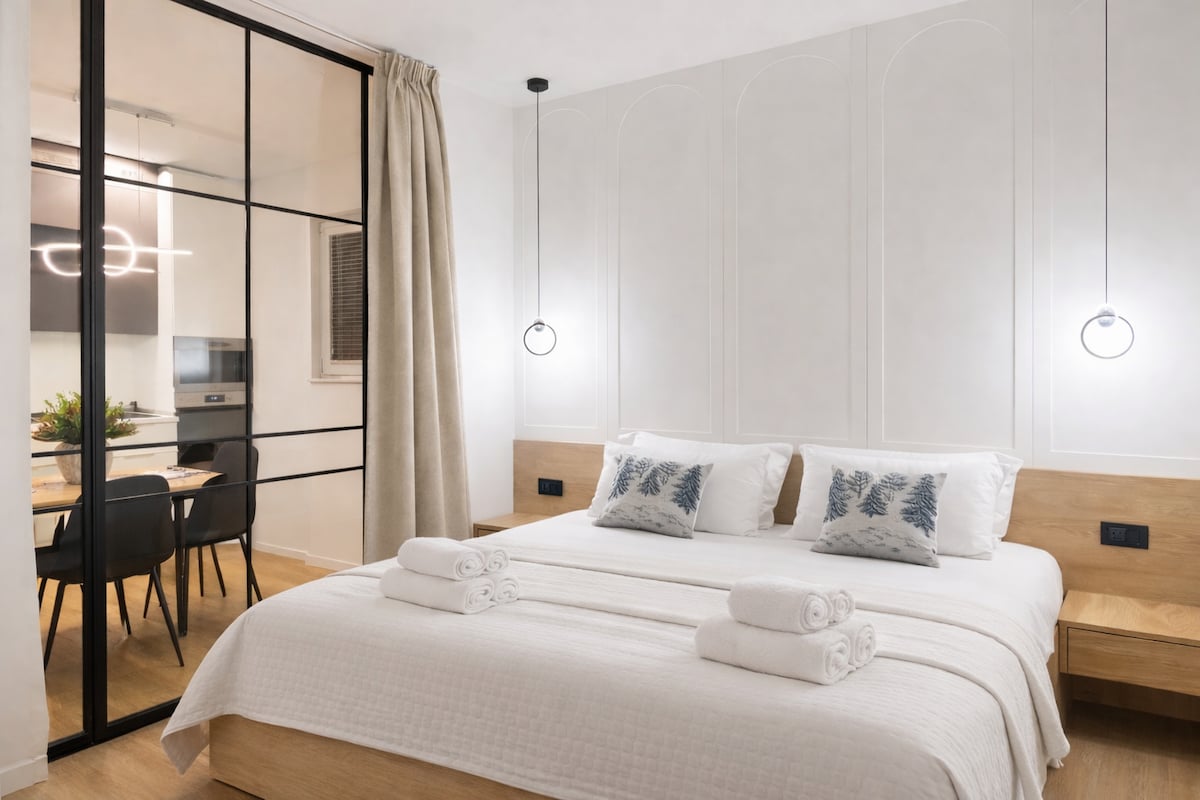 Modern, one-bedroom apartment with balcony, fast Wi-Fi, A/C and free parking. Easy walk to the Main Square, Old Bazaar, malls, cafés and restaurants. Perfect for digital nomads and travellers who can enjoy stylish, clean & peaceful stay! Sleeps 3 (queen + sofa bed), with full kitchen (oven, stove, dishwasher), bathroom (shower, washing machine, towels) and balcony. ✈️ We offer airport transfers for extra comfort (additional cost). Stay 10+ nights get one-way free, 14+ nights both ways free!