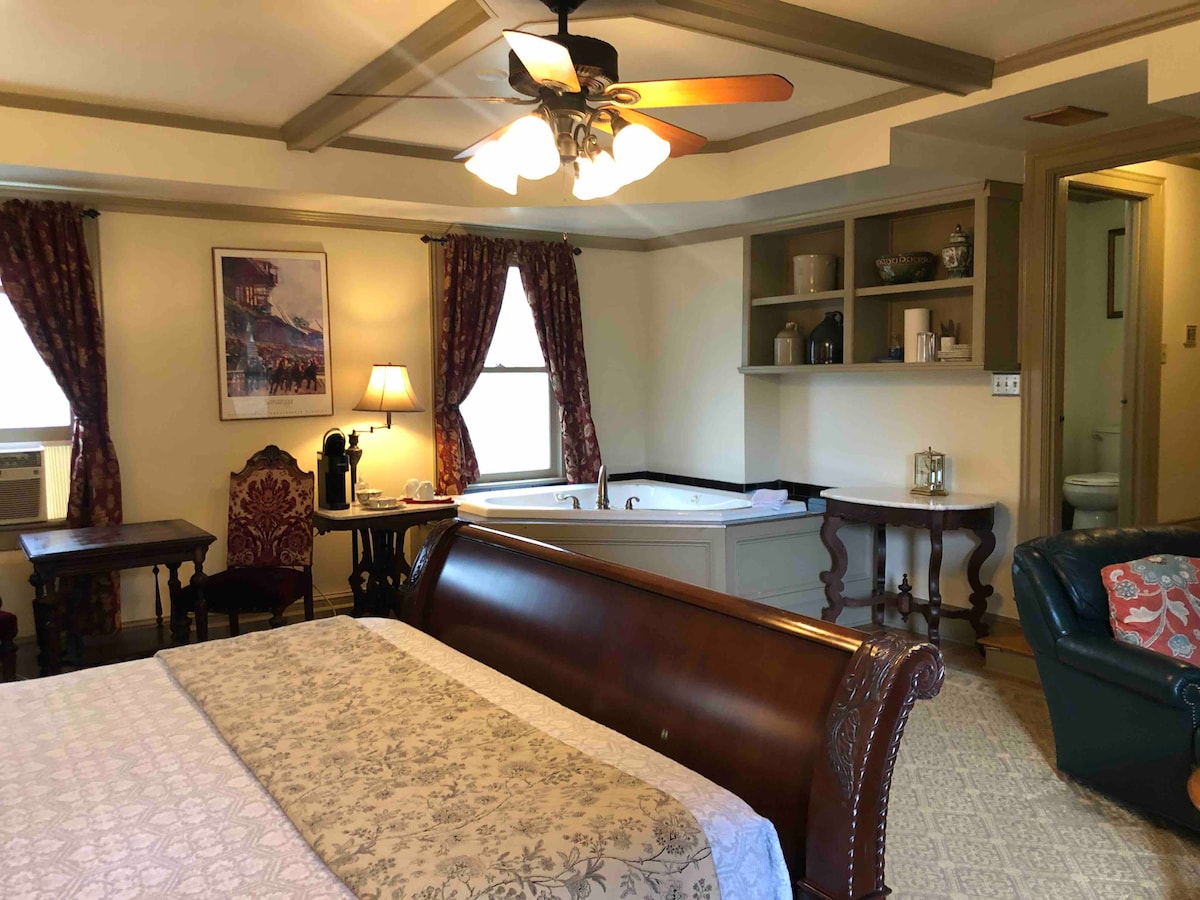 Spacious and comfy attached suite with private gated patio & entrance, 2-person jacuzzi tub, King sleigh bed fitted with buttery soft linens, gas fireplace, sitting area with Roku Smart TV, and unique display of antique toys. Everything you need for a cozy getaway. Relax in your private patio, our garden pergola overlooking the waterfall pond, or enjoy downtown only steps away! Hypoallergenic dogs are welcome with a $50 fee. Please read “Pet Rules”.