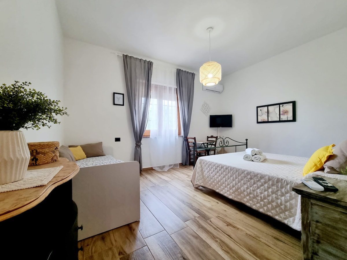 Stylish appartment for 2–4 guests. Connected to the main house with independent entrance and private bathroom, bedroom, and living area. Enjoy views of olive groves, fields, and mountains from the terrace. Located in the countryside near Villaspeciosa, just 25 km from Cagliari and 26 km from stunning beaches. Airport 15 km. Close to the Monte Arcosu Nature Reserve. Bike rental available. Solo travelers, couples, families, and pets are all welcome!