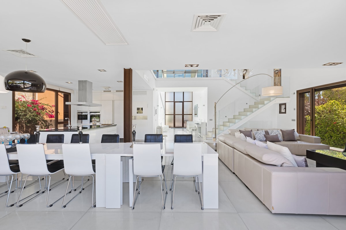 600平方公尺的三層楼迷人極簡豪華別墅。 設有多功能房間,可欣賞泳池景觀、投影機、衛星電視、電子遊戲、迪斯科和健身房。 私人泳池(9 x 5公尺)配有漩渦和多色燈光,11月至4月期間有蓋。 如有需要,可提供額外費用的泳池供暖服務。 泳池和露臺有新的防滑磚,增加了安全性。 燒烤、花園、遊戲室、15輛自行車、空調、家庭自動化和電動車充電器。