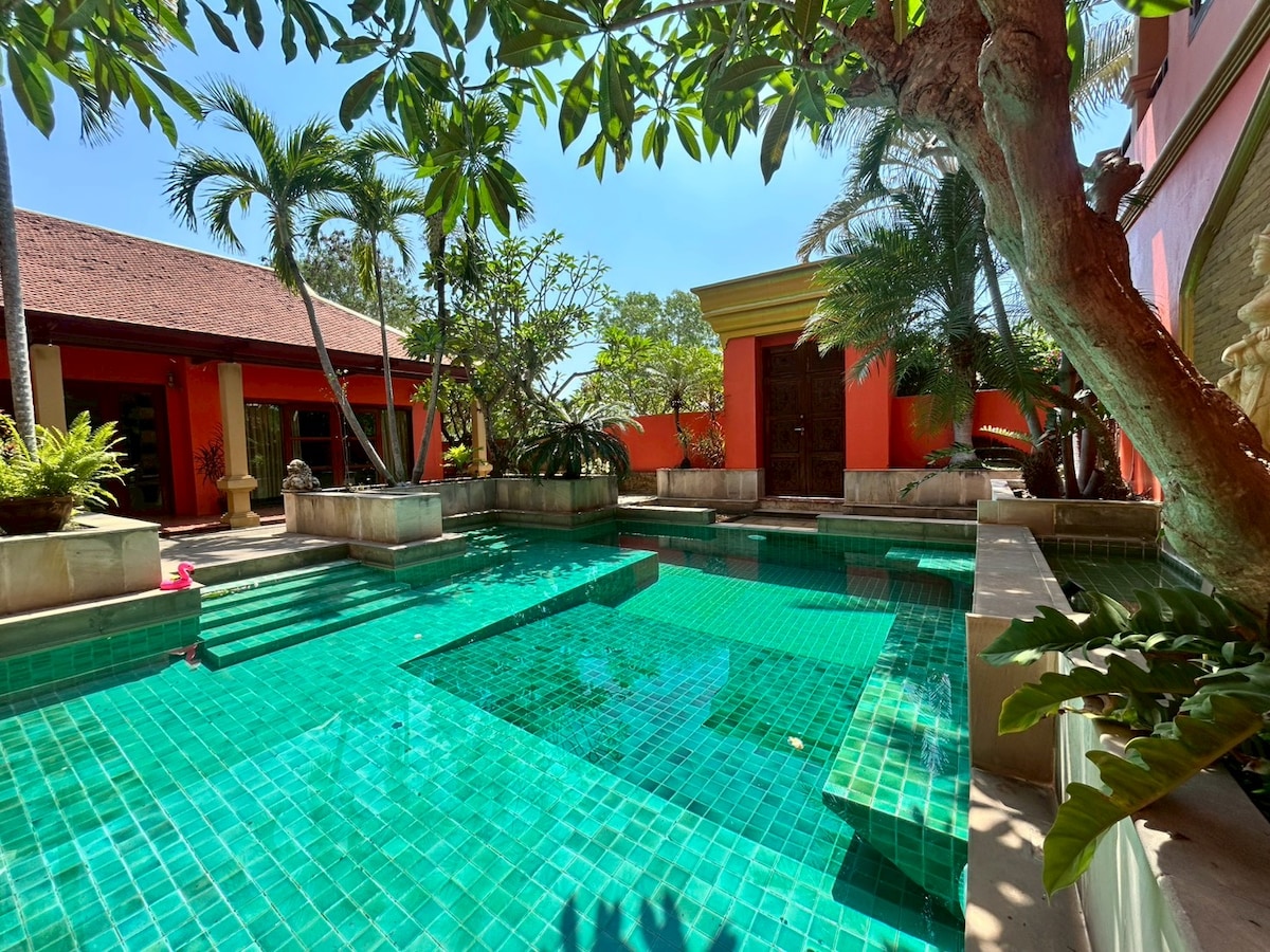 亲爱的房客朋友,您好! ①探索别墅,这是一个令人惊叹的角落房源,拥有3间装饰精美的卧室,风格奢华。 享受宽敞的生活。 这栋别墅距离迷人的海滩和当地景点仅几分钟路程,是家庭和朋友的理想度假胜地。 配备空调、烧烤区、无线网络等便利设施。 ②我们的房源位于许多景点的中心地带!距离以下列表仅5分钟路程: -赛凯海滩( Sai Kaew Beach ) - Legend Siam -邦萨尔海滩 -哥伦比亚水上乐园 -邦萨尔( Bang Sare )生鲜市场 -东芭乐园( Nong Nooch Tropical Garden ) -班安菲海滩( Ban Amphoe Beach ) - Khao Chi Chan -银湖葡萄园( Silverlake Vineyard ) - Upside Down House -距离Jomtien海滩20分钟车程 ③别墅出行方便,生活便利,安静舒适,能容纳6人聚餐,超大客厅餐厅,管家24小时免费贴心服务 ④有偿服务 曼谷芭提雅接送机、各大秀场门票优惠预定、高端定制、租车、包车、包船、翻译、地陪向导、厨师等。