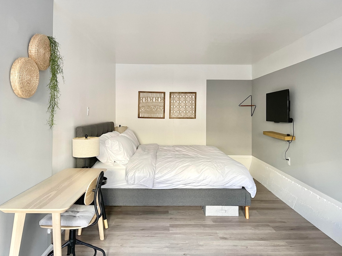 Enjoy 500 square feet of newly constructed luxury on a quiet street in the charming neighborhood of Bret Harte. The spacious bedroom has a king bed and private spa-like bathroom with heated floors. Through the double barn doors is a sitting room with two sofas that convert to single beds as well as a dining nook and kitchenette. A separate gated pathway leads to the private deck with space to relax or dine while listening to songbirds.