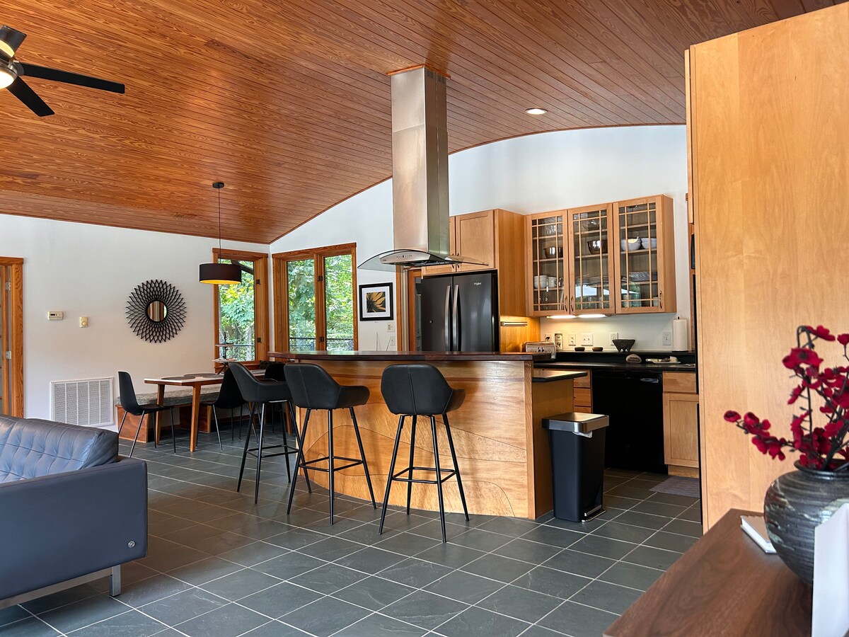 由Robert Phillips設計的600平方英尺小屋度假屋。 一間臥室、全套浴室和廚房,以及寬敞的客廳。 10英尺的天花板和精美的建築細節;露臺;噴泉坐落在10英畝的樹林中,步行小徑。15-20分鐘即可抵達北卡羅萊納大學教堂山/卡爾伯勒;皮茨伯勒和霍河上的薩克薩帕霍藝術社區。 預訂時,每隻寵物需支付每趟30美元的寵物費。 WiFi :請參閱下方的「其他注意事項」。