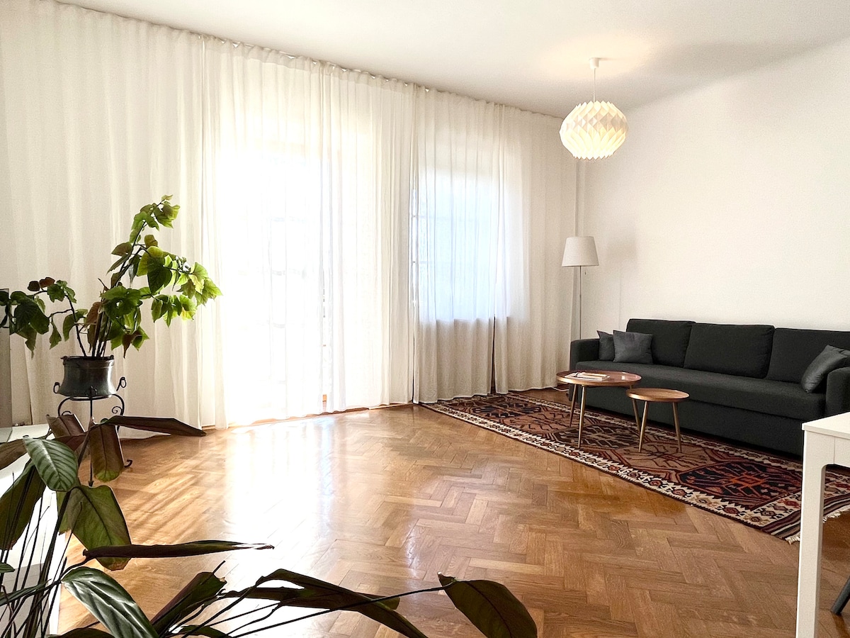 This stylish 2-room apartment (57 m²) has been completely renovated and offers everything you need for your holiday in the center of Merano. In the entrance area, there is an open wardrobe and a bench. The bathroom features a great shower and a toilet with bidet. In the living area, there is a kitchen with essential amenities, a dining area, and a large sofa bed (180x 200 cm). In the bedroom, there is a large double bed (180x 200 cm)and an open wardrobe.