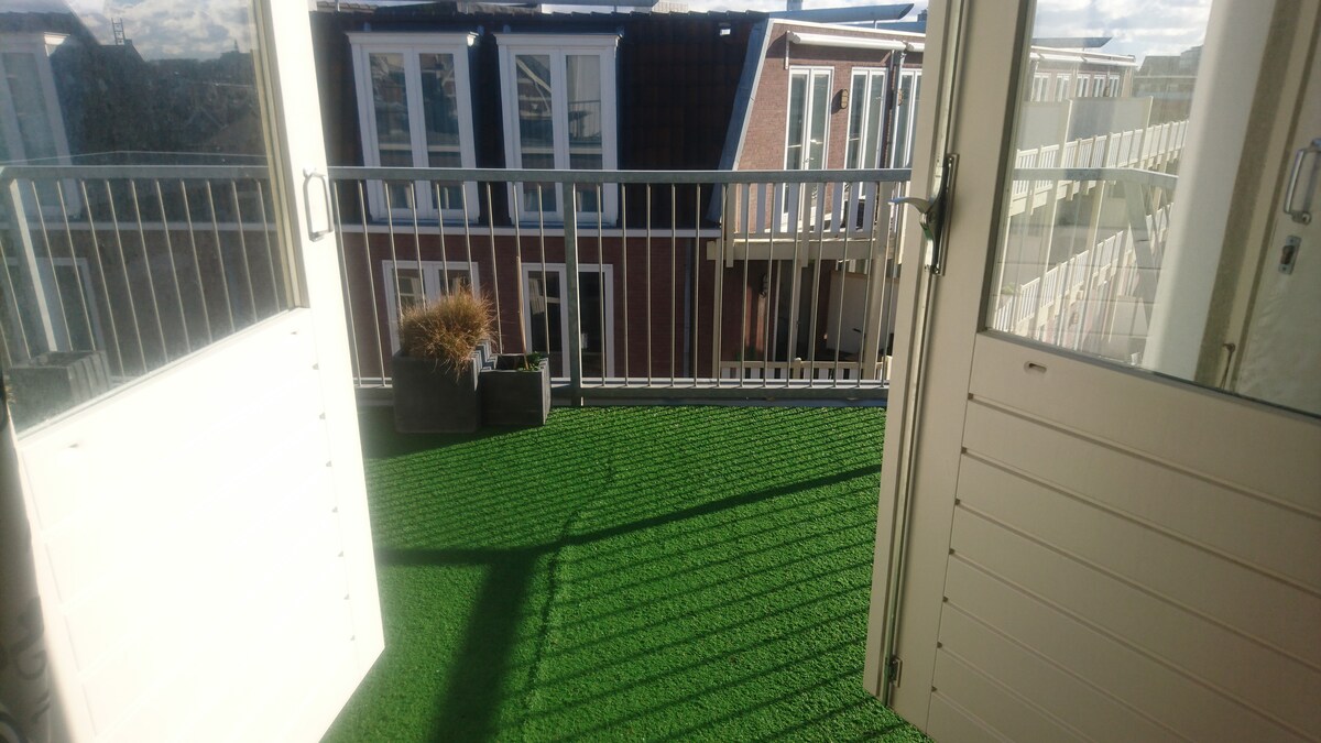 54平方米的閣樓,家具齊全,位置優越。 陽光明媚的屋頂露臺。步行即可抵達Shell、Peace Palace、ICC、Eurojust等。 附近有商店。乘坐9號電車可快速抵達海灘、市中心和火車站。 從1月3日起,我將致力於預訂 14天(-15%)和 28 天 (40%) 最多4個月。 期間空置 最少可預訂 5 天,每晚 115 歐元。