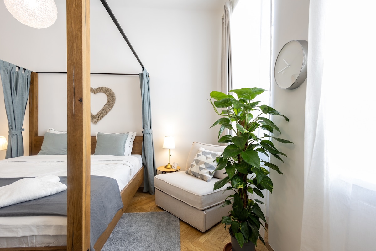 時尚的40平方公尺設計公寓,位在安靜的庭院環境中–非常適合在維也納度過安靜的夜晚。 在傾斜天花板下享受特大床、冷暖空調、快速Wi-Fi和Netflix智慧電視。 設備齊全的廚房非常適合短期或長期住宿。 在私人陽台上放鬆,欣賞屋頂景觀。 距離地鐵站僅2分鐘,距離市中心約10分鐘。 非常適合情侶、獨自旅行者和商務差旅人士。