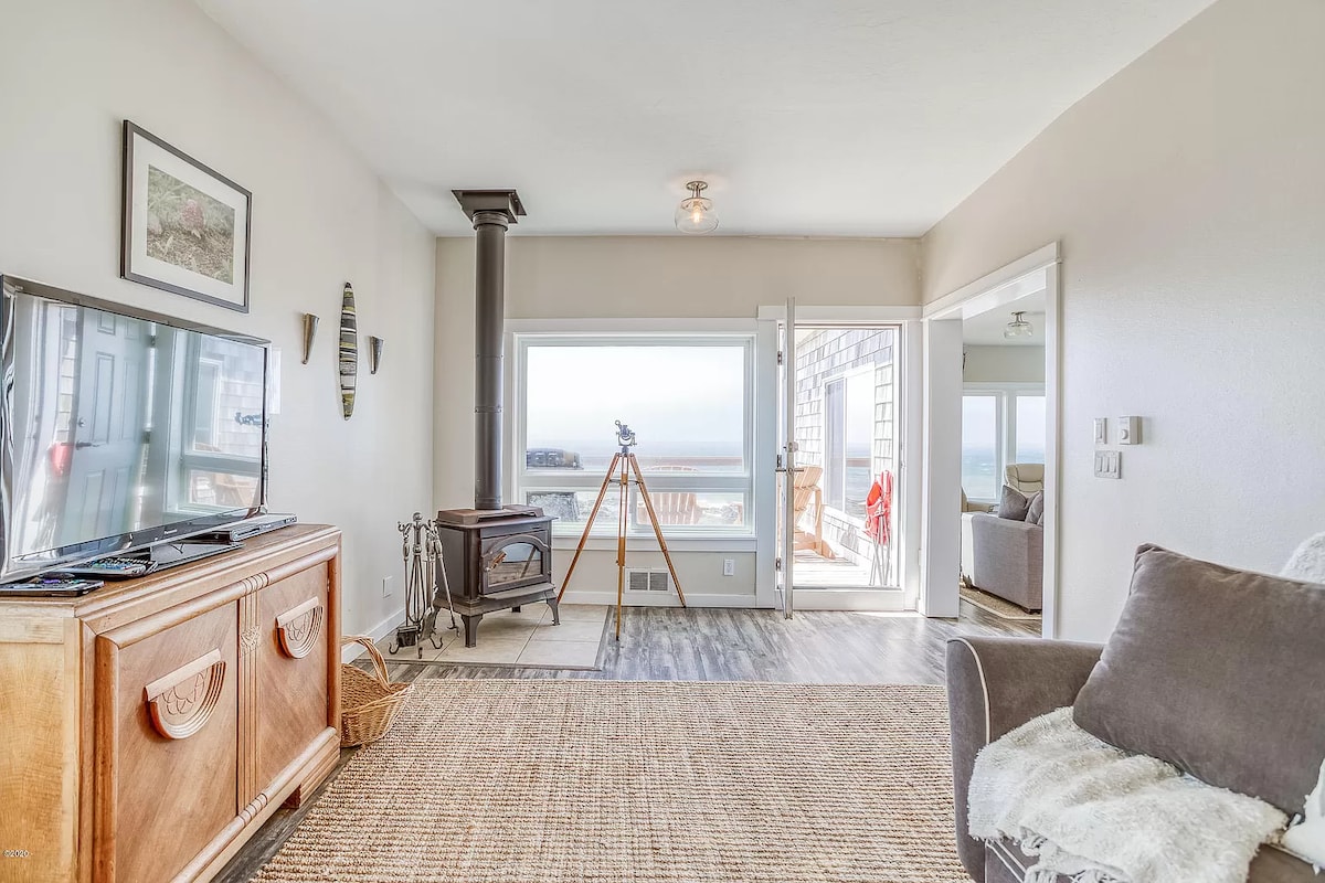 Experience the magic of the Oregon Coast in this freshly renovated oceanfront duplex cottage with gas fireplace, perfectly positioned on pristine Big Stump Beach. Step outside your door onto miles of sandy shoreline, where the rhythmic waves and coastal breeze create the perfect backdrop for your beach getaway. Inside, you'll find a thoughtfully updated interior featuring a fully equipped kitchen with modern amenities, including a dishwasher for effortless cleanup after seaside meals. The cottage accommodates up to four guests with a king bed in the bedroom and a full size sleeper sofa in a cozy TV nook off the living room. The covered oceanfront deck allows you to take in the sounds of the ocean while staying protected from the weather. The gas fireplace adds to the warm and inviting atmosphere throughout your stay. Your Perfect Base for Coastal Adventures: North to Waldport (minutes away): Dive into authentic coastal activities like crabbing from Dock of the Bay or McKinley's Oregon Coast Marina. During low tide, try your hand at clamming near the bridge. South to Yachats (just a few miles): Discover charming restaurants and explore remarkable rocky tidepools along the dramatic coastline. Further Explorations: Visit the fascinating Newport Aquarium (30 minutes north) or embark on an adventure at the Sand Dunes (45 minutes south) - accessible by foot, ATV rental, or guided tour. Traveling with a group? Cape Cod Cottages features eight additional units on the property, perfect for family reunions or friend gatherings. Shared amenities include: 300 feet of private beach access Entertainment-ready game room featuring foosball and ping pong Free guest laundry facilities Three EV charging stations