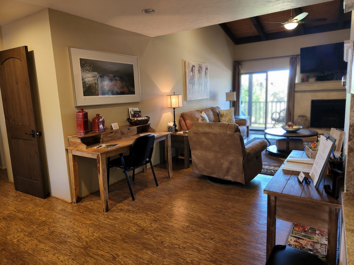 ~紅石~ 🏜️ 享受我們的狗友善(僅限狗狗) , 2間臥室,配有套房浴室公寓。 每間臥室和客廳都有電視(*壁爐可使用蠟燭)。 每個人都會喜歡這個位於一樓/無樓梯的角落單位的便利性:在露臺上放鬆身心,享受度假村風格的設施:游泳池、按摩浴池、網球場和匹克球球場、燒烤和俱樂部會所。 前往健行和自行車道以及著名的高爾夫球場超級方便。 附近有很棒的餐廳、咖啡廳和雜貨店。享受!
