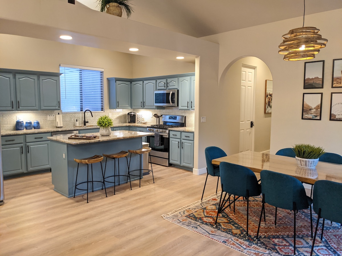 Welcome to this spacious CENTRALLY located 4 bedroom, 2.5 bath abode with SPECTACULAR Red Rock views. With minutes from trails, restaurants (walking distance), you will create beautiful memories while enjoying all the LUXURIOUS amenities. This is perfect for couples & families. Sleeps 7-8. Just 5 minutes away from Thunder Mountain trail, you will be treated to the most spectacular views. We ONLY feature NON TOXIC ALL NATURAL eco friendly products in the home Click ❤️ to add to your wishlist