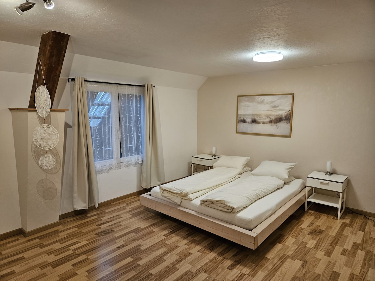 非常適合家庭、朋友入住或浪漫度假。 享受舒適的標準雙人牀、2張單人牀、沙發、花園。 套房位於二樓,一樓有獨立浴室。 騎自行車探索,在花園中放鬆身心,欣賞山景,品嚐附近的湖泊活動。 可選服務包括機場接送、早餐、瑞士美食(奶酪火鍋/拉克雷特)。 適合家庭入住、運動愛好者和音樂氛圍!