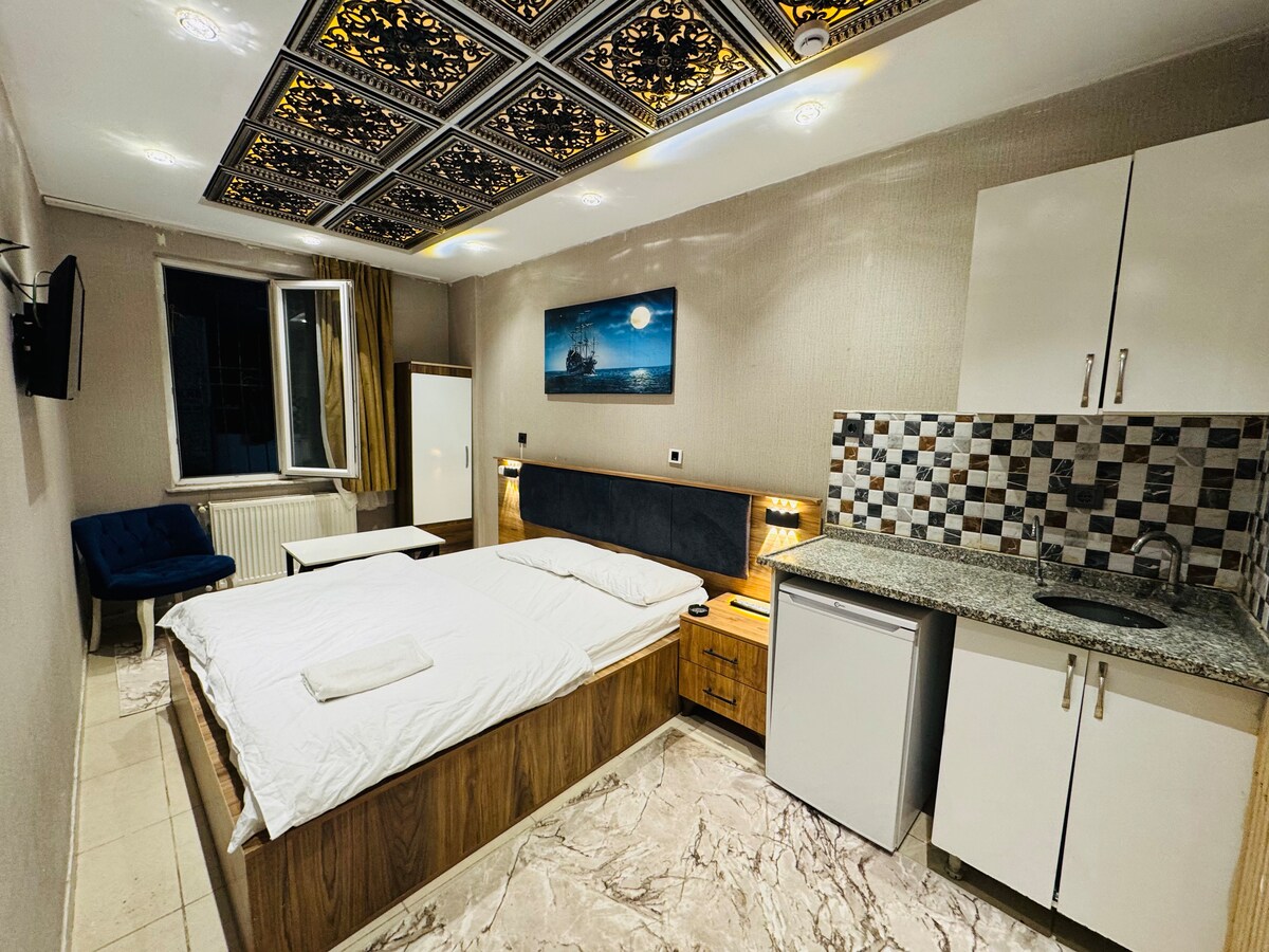 Bu sakin, şık mekânda arkanıza yaslanın ve rahatlayın. Detaylara verilen önem ve modern dokunuşlarla tasarlanmış bu özel pansiyon odamız, hem estetik hem de işlevsellik arayan misafirler için ideal bir konaklama deneyimi sunuyor. Odamızda, geniş ve konforlu bir yatakla birlikte sade ama zarif bir oturma alanı, modern çizgilere sahip bir mutfak bölümü ve gününüzü dinlendirici bir şekilde sonlandırmanıza yardımcı olacak detaylar bulunuyor. Mutfak alanında mini buzdolabı, lavabo mevcut