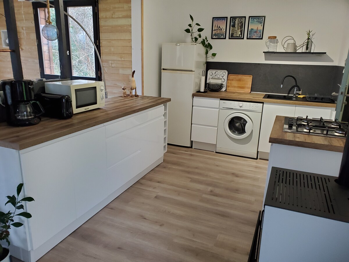 Ce chalet douillet de 17 m2 est idéal pour un séjour à 2, à seulement 10 km de Honfleur. ✨ Profitez du jacuzzi pendant votre séjour au tarif de 30€/ jour de 10h à 20h pour 2 pers. 💆♀️Massage 30 min 35 €/pers. 1h00 60€/pers. 🥐Le petit-déjeuner est proposé au tarif de 12€/ pers. 🐾 1 hectare de jeux Vous croiserez nos deux compagnons: 🐶VLADIMIR, le BOUBOU mâle castré 1 an 🐶MOSHI, la reine incontestée des lieux Berger Australien non stérilisée 2 ans