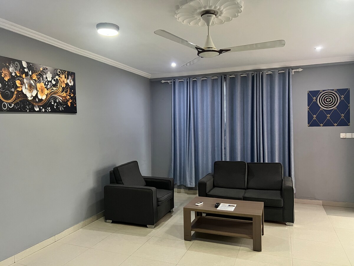 這間共用現代化、全方位服務、適合家庭入住的雙臥室公寓,配有2.5間浴室,提供私人屋頂遊泳池和獨家屋頂酒吧和烤架,供家庭或房客使用。 房源位於Takoradi的Anaji區中心,設有設備齊全的廚房和用餐區域,配有一個非常適合烹飪、工作或娛樂的島嶼。 客廳配有75吋智慧電視、Netflix、Wi-Fi、行政辦公桌和音響吧臺供您娛樂
