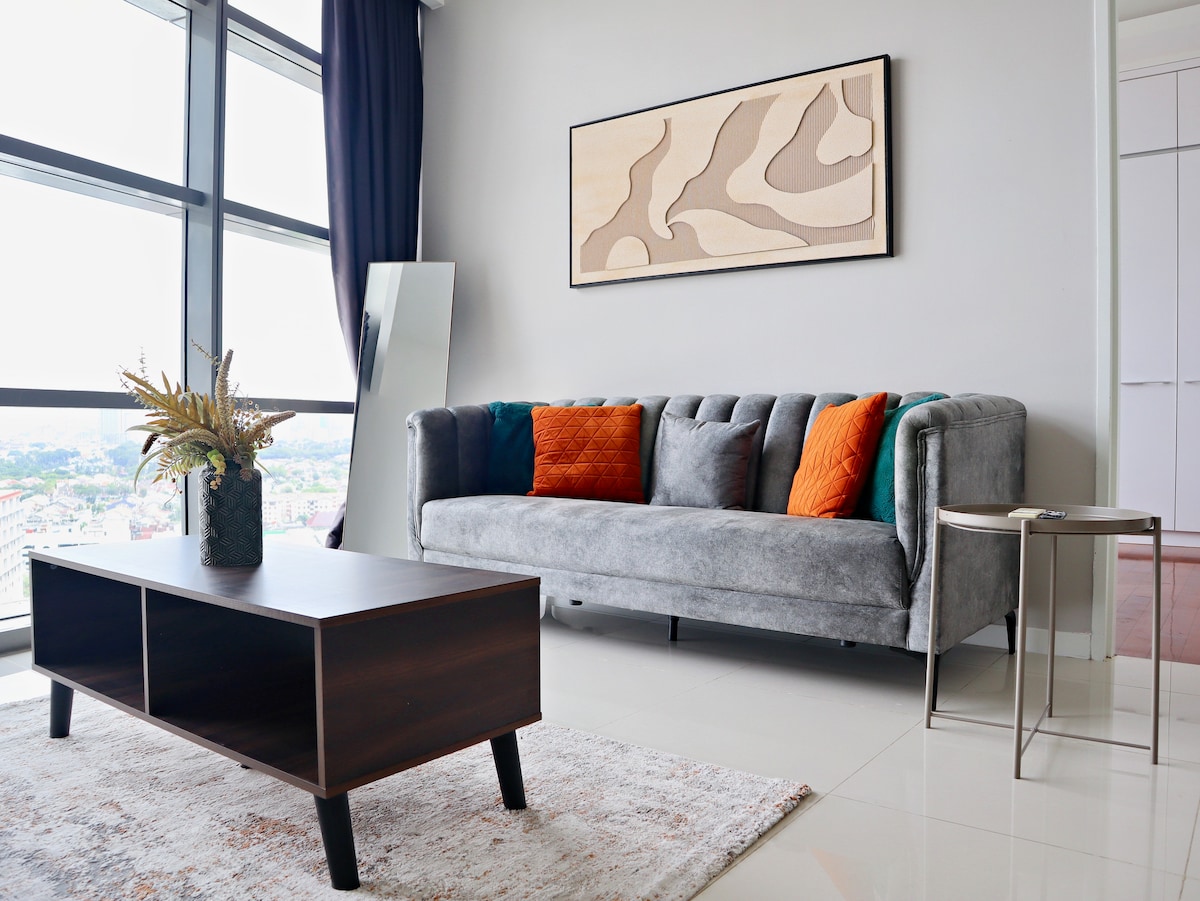 -地點: The Hub, SS2 - 1-5位房客 - 32樓(城市景觀) - 24小時高層保全 - 55吋智慧電視( Netflix和Youtube ) - 2 張雙人床 - 1張皮革感覺推回沙發牀 - 3臺空調(超級冷氣系統) -熱水器 -吹風機 -熨鬥 -微波爐 -烹飪爐 -洗衣機烘衣機 - 彩色窗戶