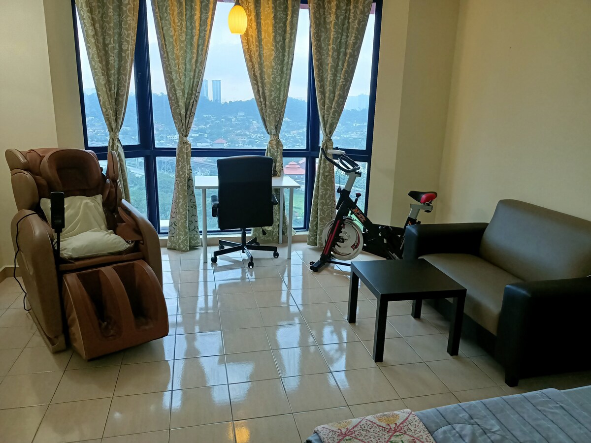 明亮的單間公寓,位於27樓,可欣賞吉隆坡城市天際線和湖泊的美景。 和平的郊區,距離吉隆坡市7公里。乘坐火車20分鐘即可抵達吉隆坡城中城,10分鐘即可抵達吉隆坡中央車站。步行7分鐘即可抵達火車站。 100mbps無限數據WiFi。 Android電視和Netflix。 小廚房內有單人電磁爐、抽油煙機和炊具 深受喜愛的房源,房客大多是長期住宿的房客。 30多年的建築,但我的單位現代化、整潔,並備有充足的設施 可直接前往商場前往超市等。