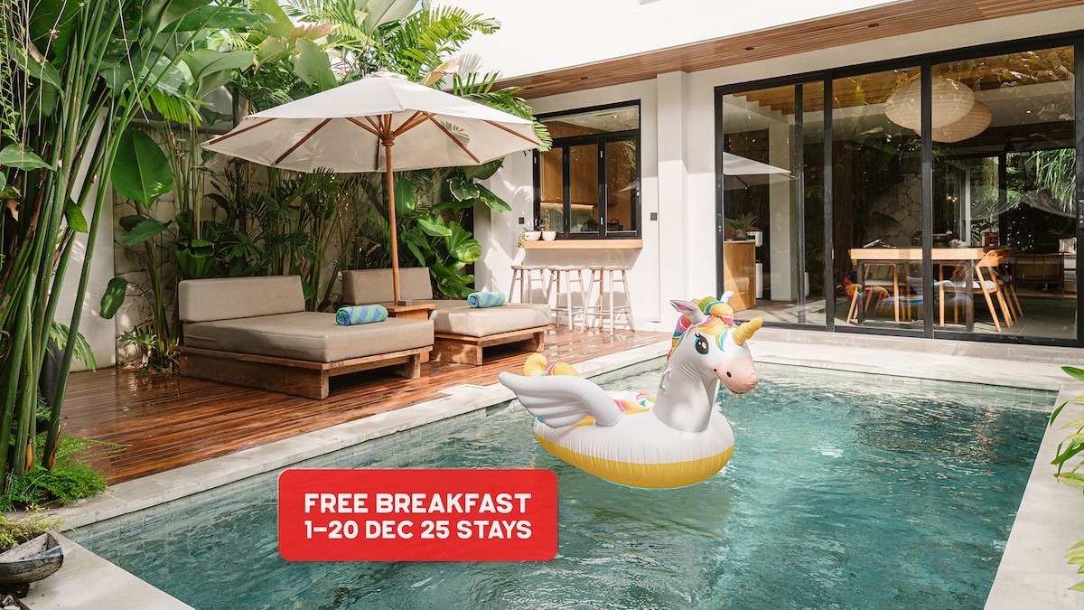 3 間套房臥室,最多可供 8 位房客入住,私人泳池配有 6 張日光浴床、健身房、屋頂露臺和 Nespresso 咖啡機(請自備咖啡膠囊!)。 享受空調關閉和開放的客廳、風扇涼亭和安靜的位置,距離餐廳僅200公尺,距離Jalan Legian 400公尺,距離Padma & Melasti海灘850公尺。 配有經理、2名管家和夜間保安。 強大穩定的Wi-Fi,確保您隨時保持連線,同時享受舒適、服務和位置。