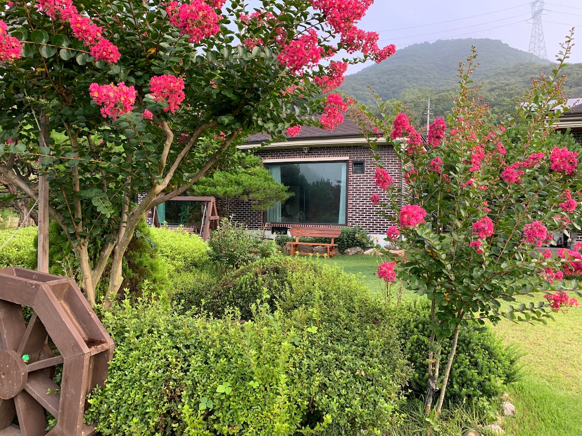 We have spacious Garden with lovely pine trees and seasonal flowers. You can feel healing and relax with our lovely calm garden. We have also small farm growing ingredient fruits. you can pick & enjoy eating for breakfast in summer season. You can take a walk along the riverside path near our house and enjoy water skiing and paragliding. Public transportation is also available. It's a 10 - minute walk from Asin Station on the Gyeongui-Jungang Line. Pick-up from Asin Station is also available.